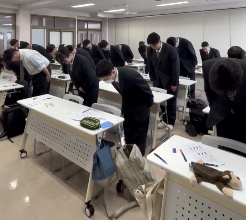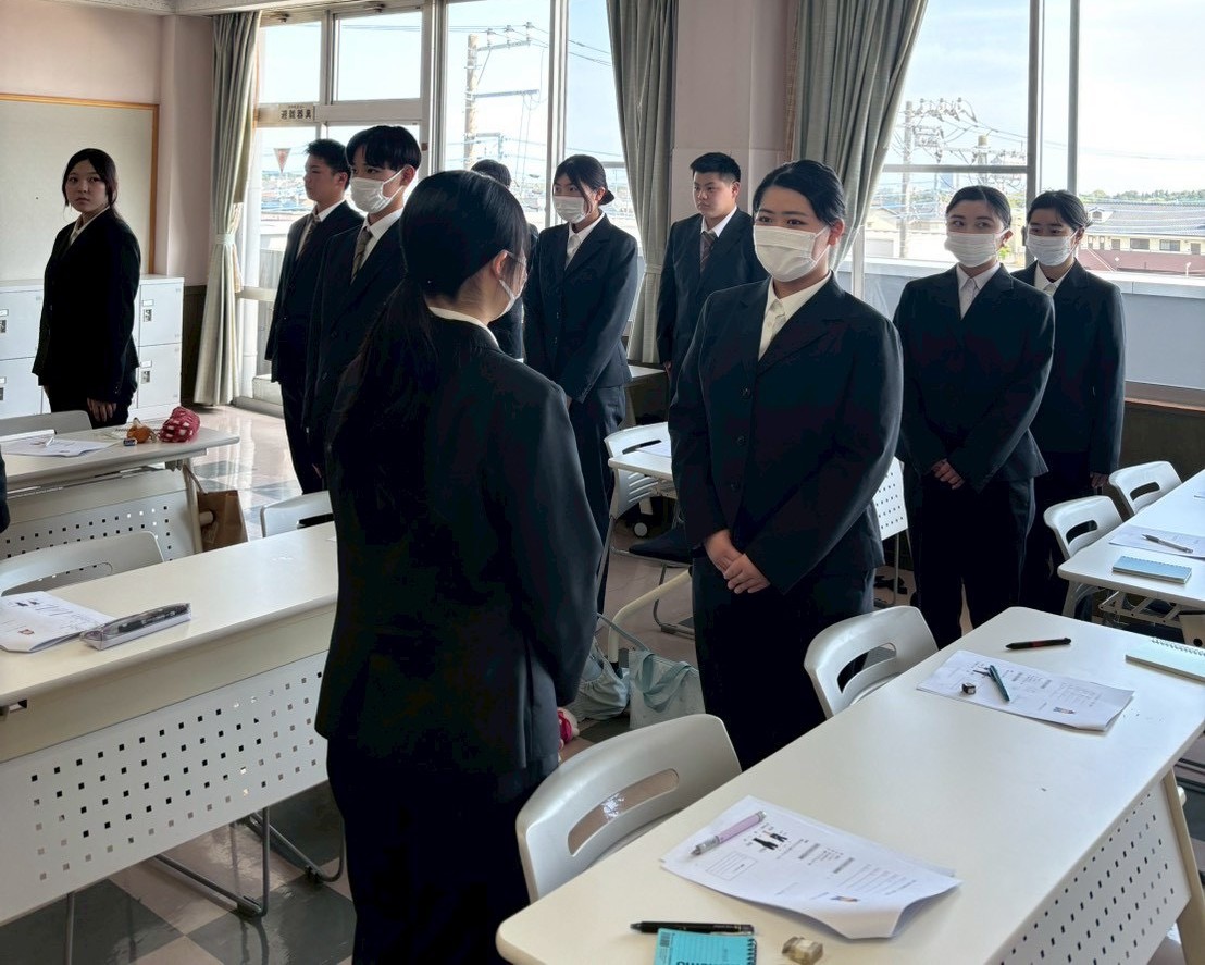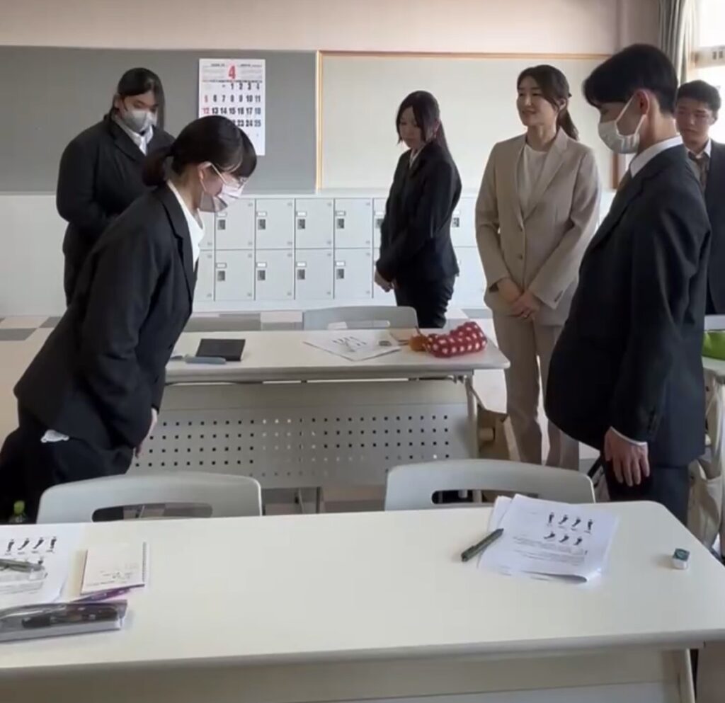 更新日: 2026年4月23日 授業 マナー講習 2026/4/20(月) 今回は社会人としてのマナー講習で講師の加藤真理子先生にお越しいただきました。 先生は航空会社JALのファーストクラスの教育係で正式な資格をお持ちの先生です。 1学年ではお辞儀の仕方などの基本的な所作をご指導いただきました。